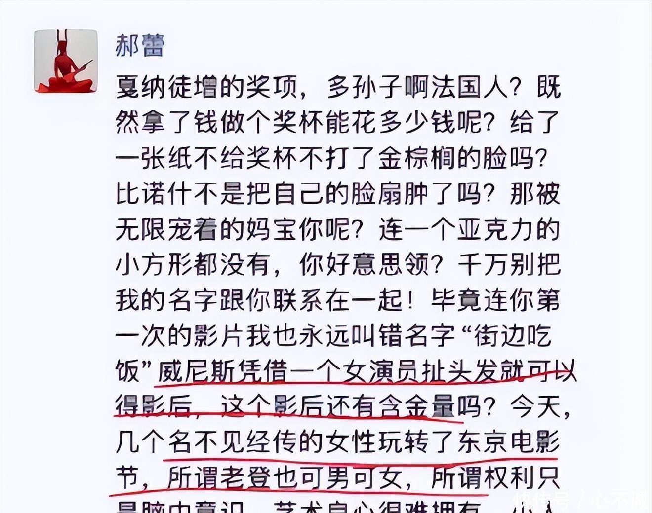 白百何的愤怒并非针对奖项归属,而是剧组把自己排除在外的处理方式。她在后来的长文中详述,导演张律卖惨打动她,以“赚钱给妻子治病”为由打动她参加自己的电影,她出于朋友道义,退掉其他工作帮他,支持他,为此,她不顾经纪人反对,与张律合作《罗目的黄昏》和《春树》两部电影,还帮他拉投资。后来有网友挖出,制片人彭瑾和导演张律之间竟然有婚外情!网友惊呆了,演艺圈这水怎么这么浑哪?02相比于白百何就事论事的调调,郝蕾的朋友圈长文将争议推向更广阔的领域。她质疑戛纳电影节为《狂野时代》增设的评审团特别奖是“徒增的奖项”,并直言“既然拿了钱做个奖杯能花多少钱”,暗示奖项背后存在金钱运作。她还将导演毕赣的作品《路边野餐》戏称为“街边吃饭”。