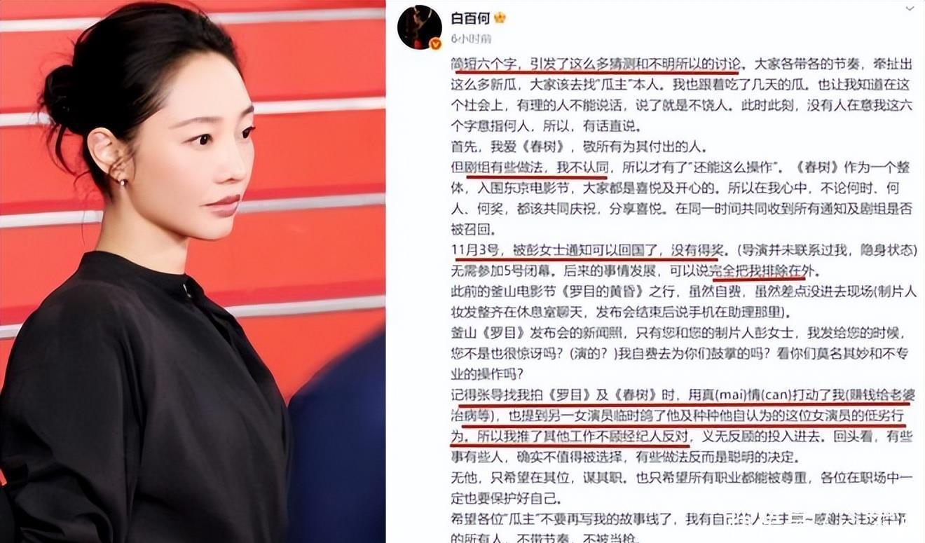 随后,11与7日,资深演技派郝蕾疑似在朋友圈发表长文,六连问,矛头直指三大国际电影节——抨击戛纳“装孙子”,质疑威尼斯影后辛芷蕾的含金量,嘲讽“几个名不见经传的女性玩转了东京”。一时间,继古二录音门事件之后,影视圈的暗流被彻底搅动,表面光鲜的国际奖项背后,那些不为人知的博弈与暗涌,终于浮出水面。原来哪里的水都不清白,原来,电影界最高的艺术类电影大奖也充满了金钱的铜臭味……01本届东京电影节本该是华语电影的又一次闪耀。白百何主演的《春树》入围主竞赛单元,她带着两个儿子飞赴日本,对这次盛会表现出高度重视。然而,闭幕式前两天的11月3日,制片人彭瑾通知白百何“没有得奖,不用参加闭幕式”,建议她提前回国。