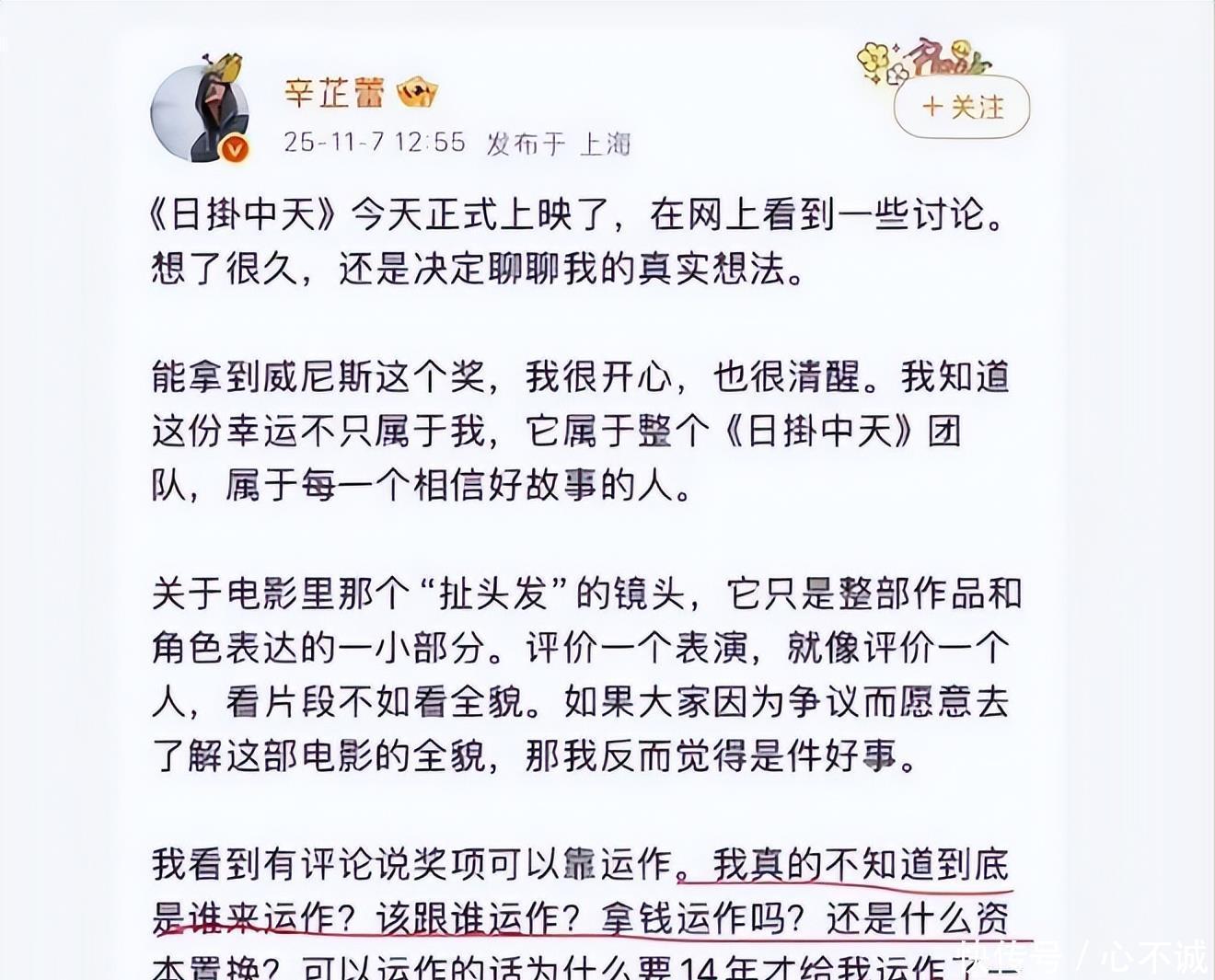 至于威尼斯电影节,郝蕾毫不留情地讽刺辛芷蕾靠“扯头发”拿影后,反问这奖项还有多少含金量。一个月前,辛芷蕾荣获威尼斯金狮奖最佳女演员的报道还历历在目,鲜花和掌声都在响;如今却被“不配”的质疑包围。网友随后发现,郝蕾的愤怒可能源于个人恩怨。早在《狂野时代》拍摄初期,就有宣传透露郝蕾参演,甚至具体到将与赵又廷合作第三幕“启示录”。但电影入围戛纳后,官方海报和演员表上都没有她的名字。但这仅仅是网友推测罢了,其实在公开发布的宣传海报中,从来就没有郝蕾参演的信息。03面对质疑,辛芷蕾选择公开回应。她强调电影中“扯头发”的镜头只是角色的一小部分,评价表演应该看全貌。