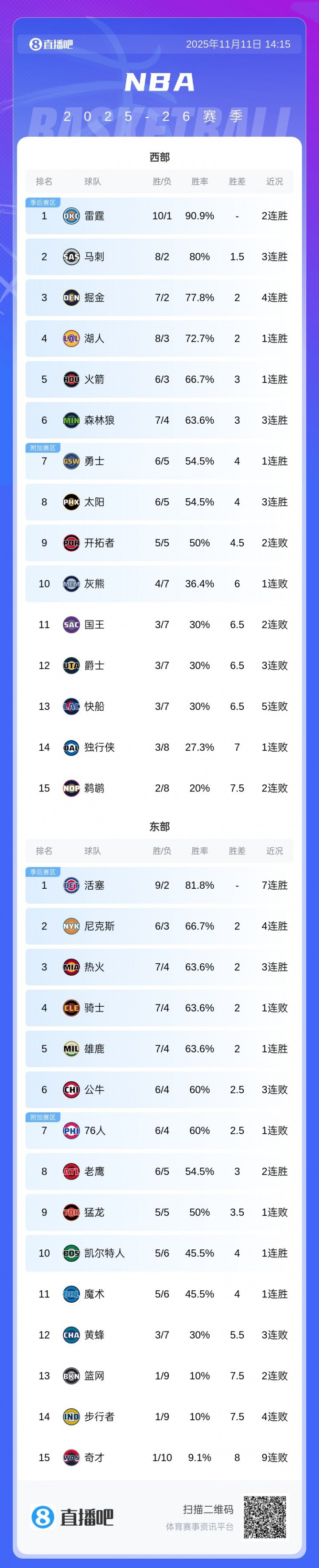 湖人自媒体BronMuse发文写道:“湖人8胜3负、勇士6胜5负、快船3胜7负,今晚能睡个好觉了。”