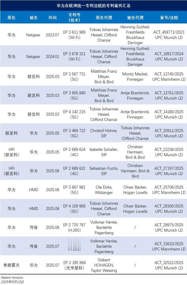 例如,华为目前在欧洲统一专利法院的诉讼经历就包括美国Netgear,惠普,德国弗劳恩霍夫,以及中国台湾联发科等。