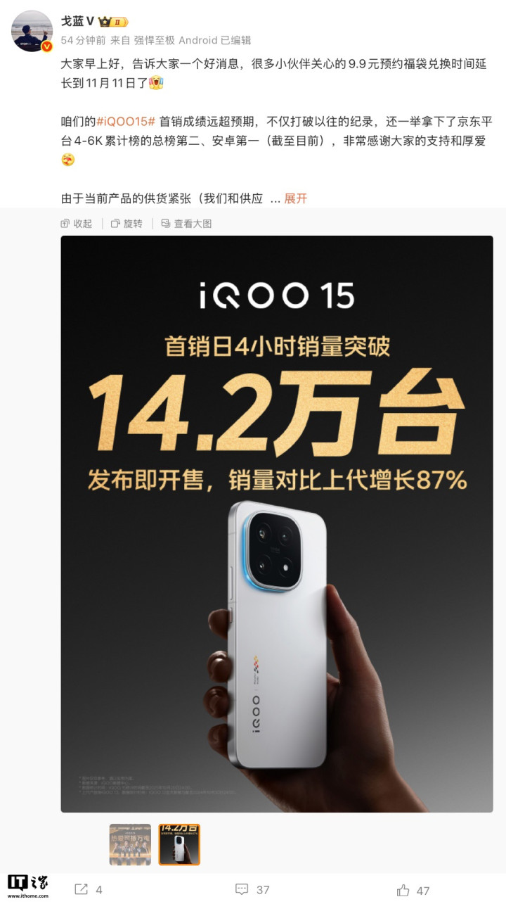 IT之家10月28日消息,iQOO产品经理@戈蓝V发文正规杠杆炒股平台,宣布iQOO15手机的9.9元预约福袋和首销权益兑换时间延长到11月11日,并透露相应机型首销成绩远超预期,不仅打破以往的纪录,还一举拿下了京东平台4-6K累计榜的总榜第二、安卓第一(截至目前)。