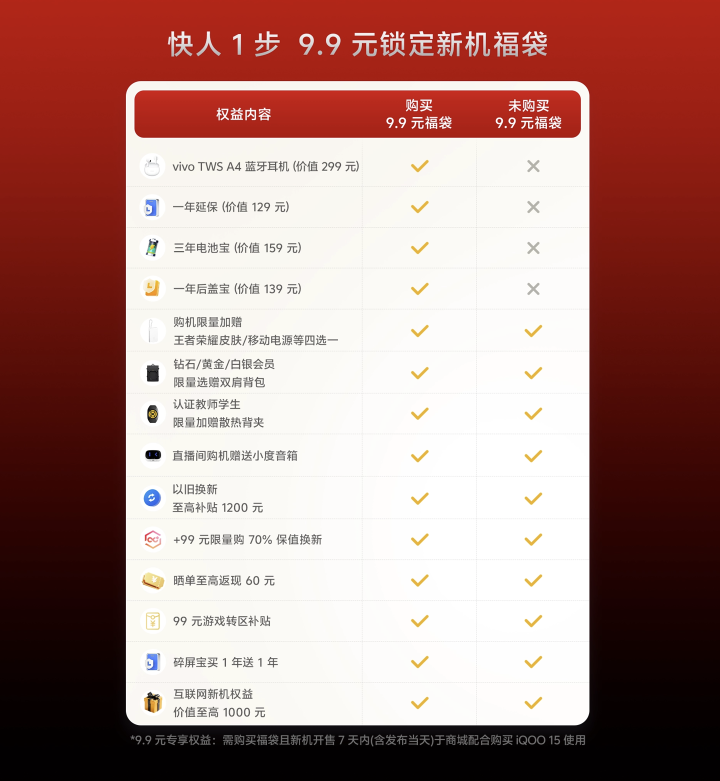 同时,此前购买9.9元预约福袋者还可获得“vivoTWSA4蓝牙耳机”、“一年延保”、“三年电池保”、“一年后盖保”服务。