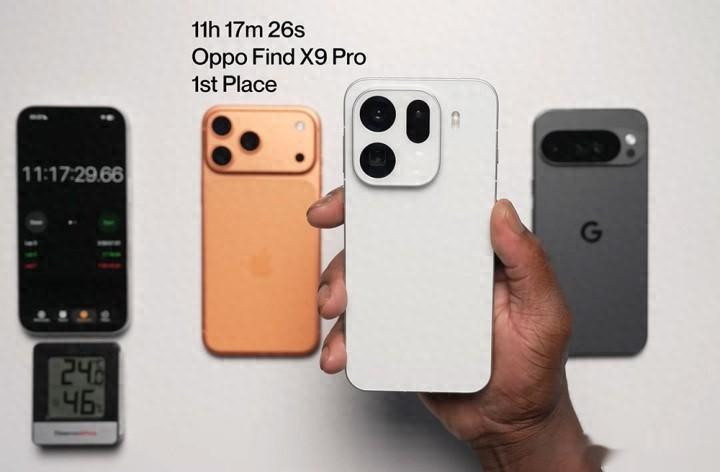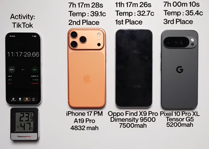 三款手机均撑过了第一轮测试,Pixel 10 Pro XL在使用7小时后自动关机,iPhone 17 Pro Max多坚持了一段时间,在7小时17分钟时关机。OPPO Find X9 Pro则持续运行了11小时17分钟。4小时的测试续航差距,已经能够在日常使用中产生决定性的影响。