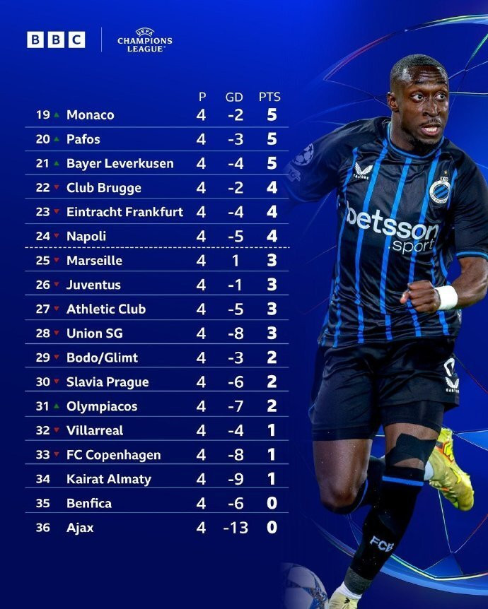 本轮爆冷未赢的豪门则有巴萨和切尔西,两队都在客场翻车。巴萨3-3战平布鲁日,而切尔西则在轮换阵容情况下2-2战平卡拉巴赫。两队分别跌至积分榜第11位和第12位。