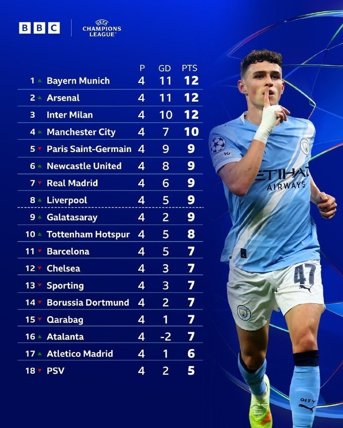 目前排名积分榜第5至第8位的分别是大巴黎、纽卡、皇马和利物浦。他们与拜仁、阿森纳、国米和曼城一起,在欧冠赛程过半情况下,这8支球队处于淘汰赛直通区。